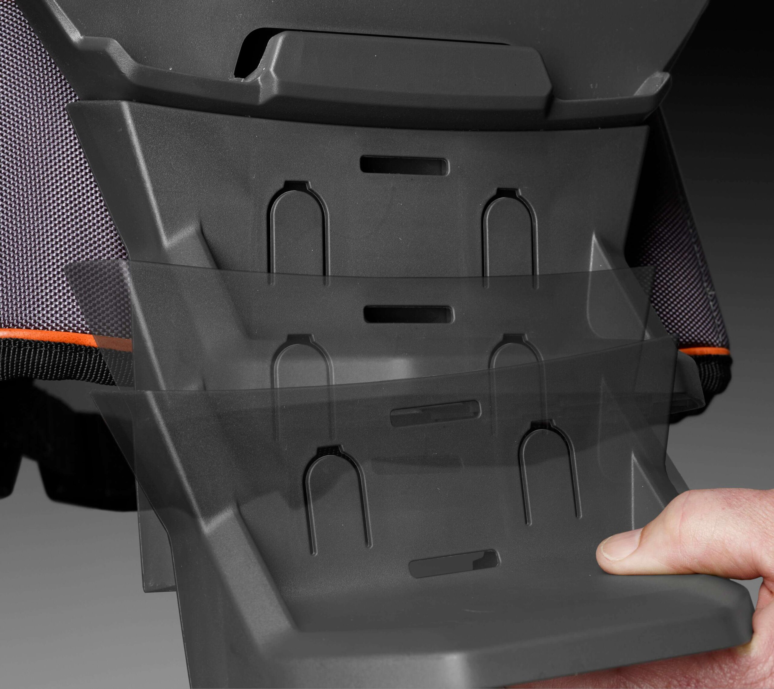 Harnais ergonomique novateur pour un ajustement parfait. Comme les accus sont facilement extraits, les utilisateurs peuvent changer d’accu sans devoir retirer le harnais. Pied amovible, utilisé pour permettre de poser le sac à dos au sol sans que le harnais n’absorbe l’humidité ou se salisse.