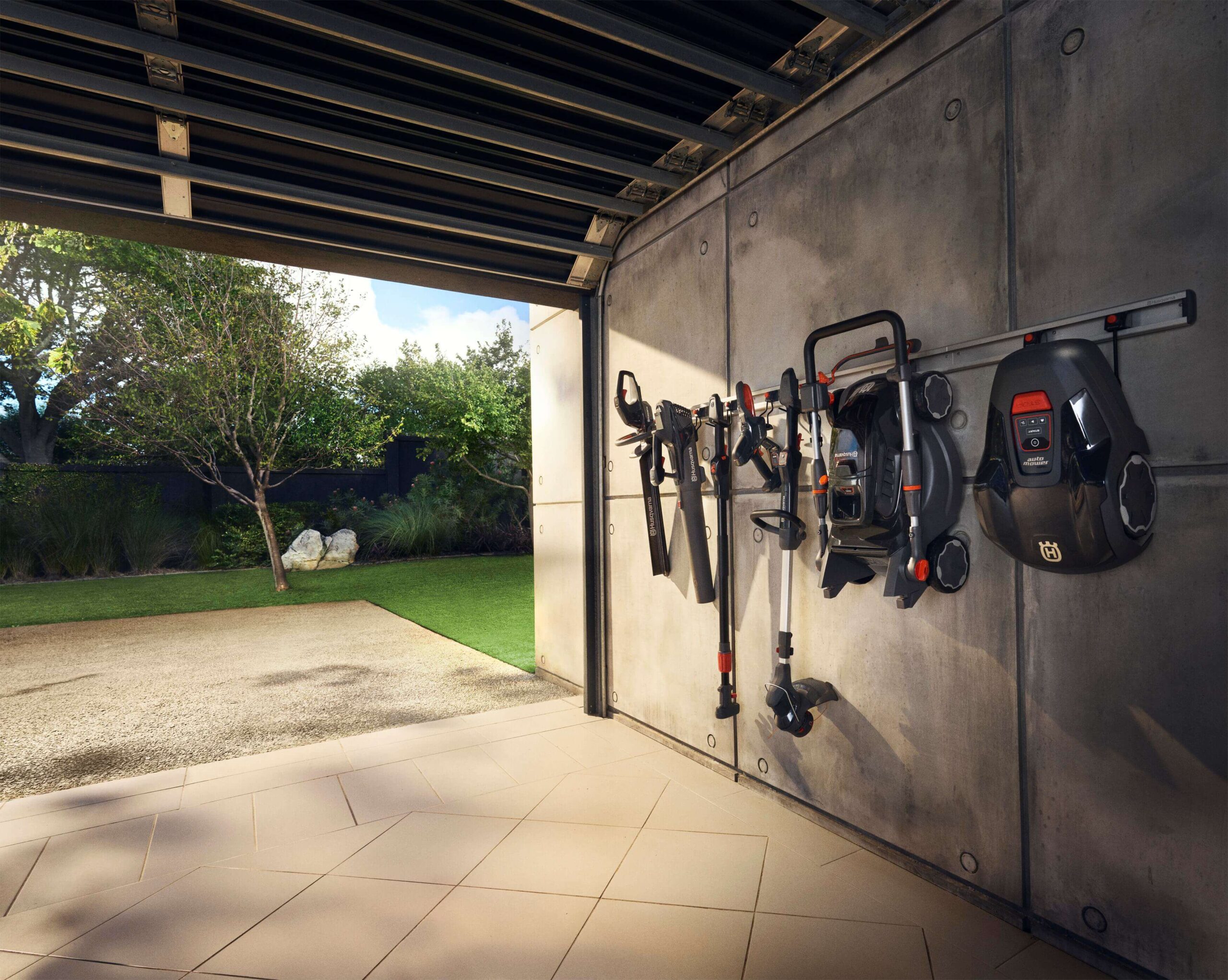 Les outils Aspire Husqvarna fonctionnant sur batterie ont été conçus pour les espaces limités. C’est pourquoi chaque appareil dispose d’un crochet de suspension sur mesure qui peut être monté directement sur le mur ou utilisé avec le rail mural Aspire Husqvarna. Ce système de rangement peut être complété par n’importe quel outil de jardinage.