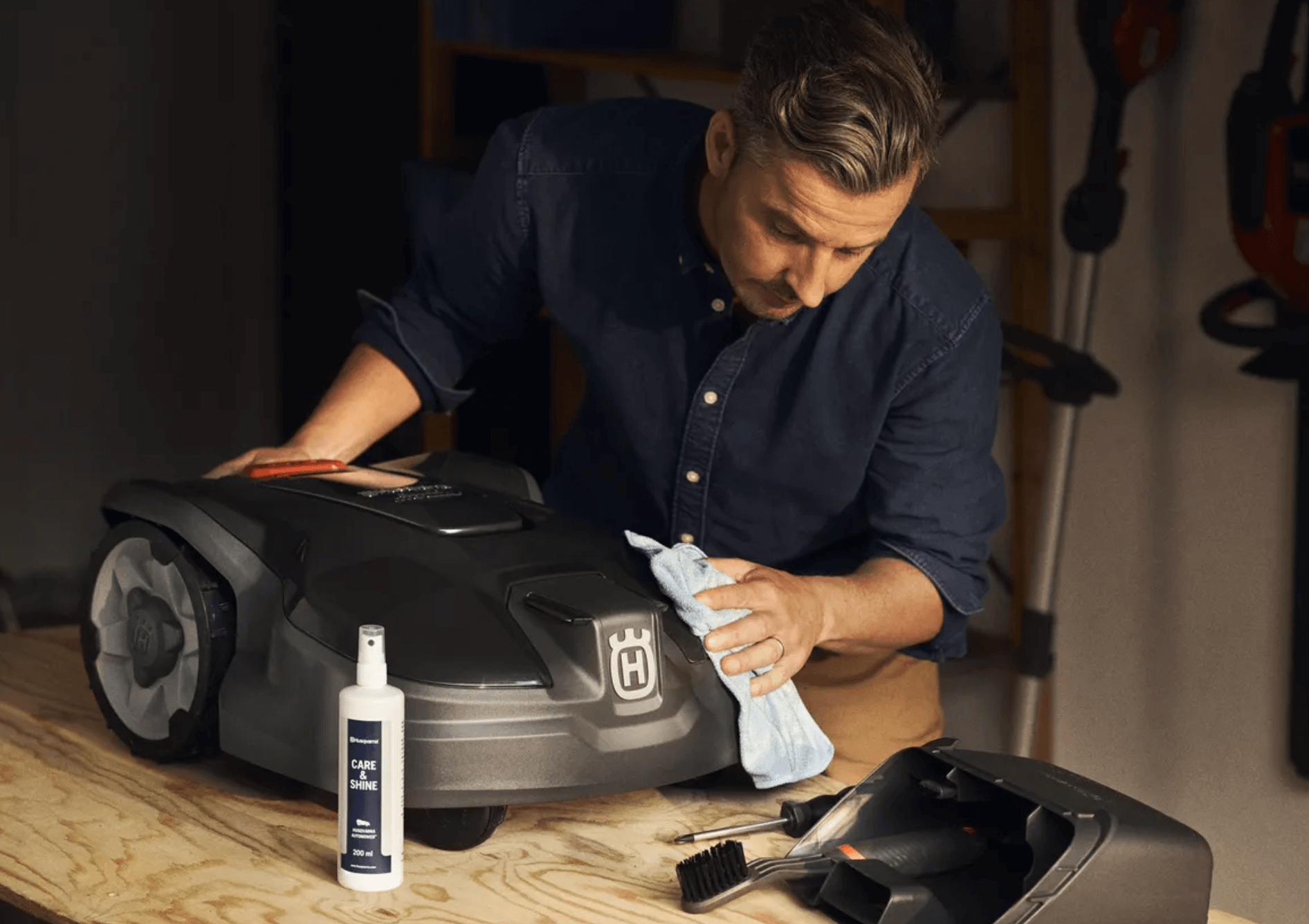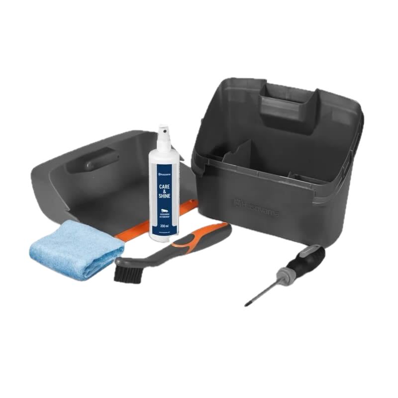 Le kit de nettoyage et d’entretien pour Automower comprend : deux brosses spéciales, une de forme très mince et raide et une petite avec un grattoir pour éliminer l’herbe et la saleté. Un tournevis pour remplacer les lames. Une éponge de polissage pour nettoyer les connexions sur la tondeuse et la station de charge. Un chiffon et un spray d’entretien, pour faire briller les composants en plastique.