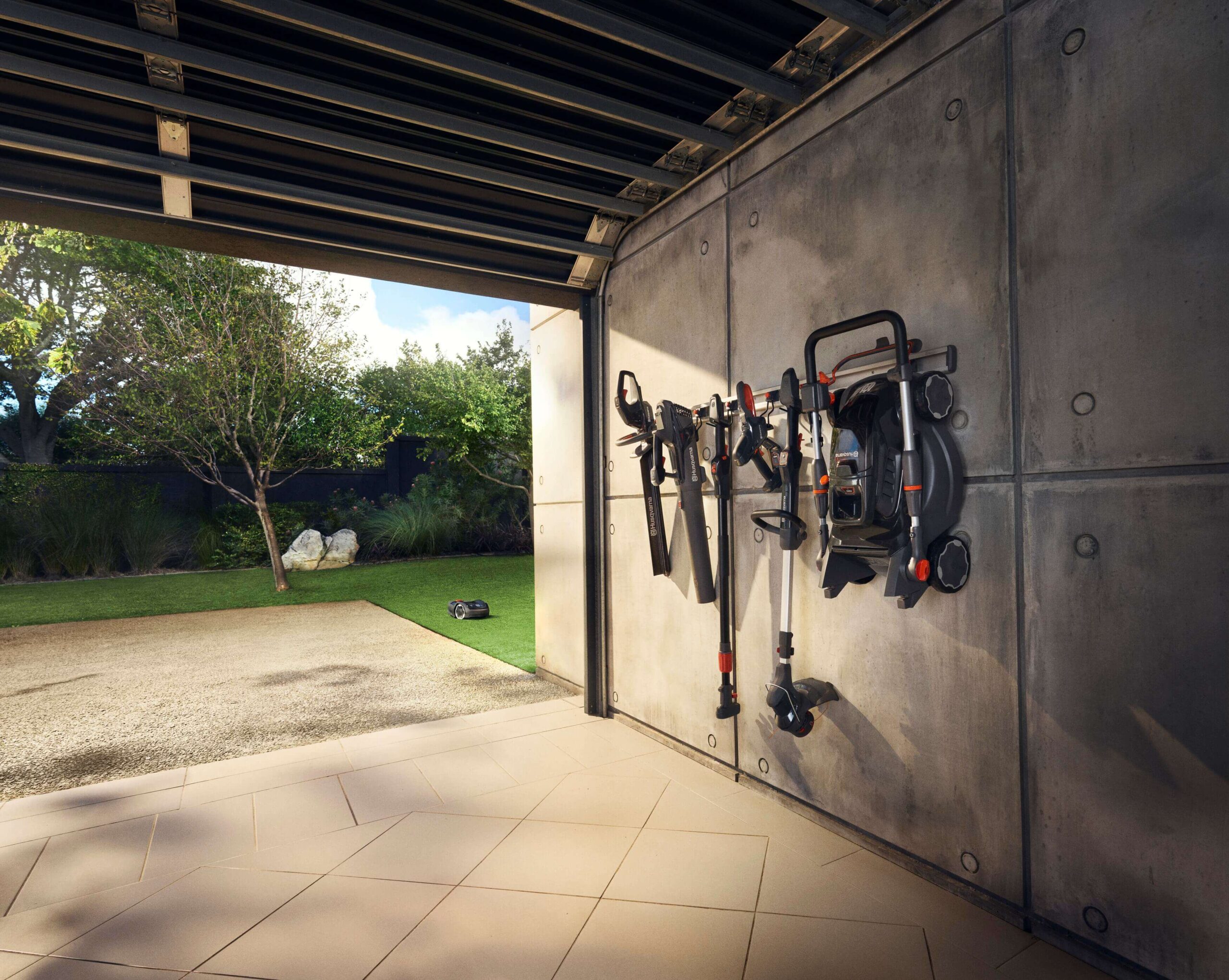 Chaque produit Aspire est livré avec un crochet qui s‘adapte à ce rail mural. Également compatible avec le crochet de stockage pour NERA Automower®, étagère murale et le kit de support mural Aspire de Husqvarna pour les outils de jardin comme les outils à main, le tuyau d‘arrosage ou le balai. Des vis, des chevilles en plastique et des embouts sont fournis pour un montage propre du rail.